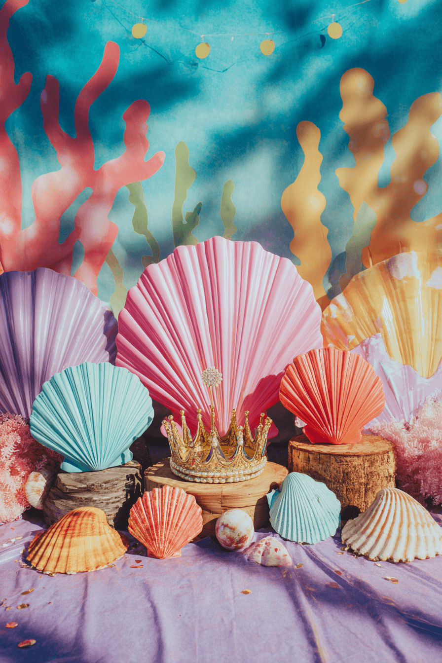 Create a stunning photo area using layered fabrics ocean colors and soft sparkle that enhances every picture. Your Mermaid Birthday Party memories deserve a perfect backdrop so start building it today!