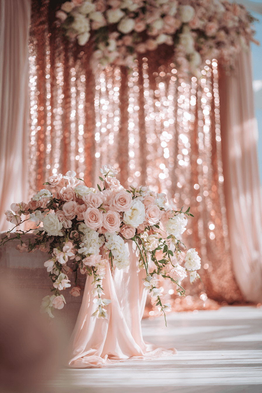 15. Rose Gold Wedding Backdrop Design with Radiant Style