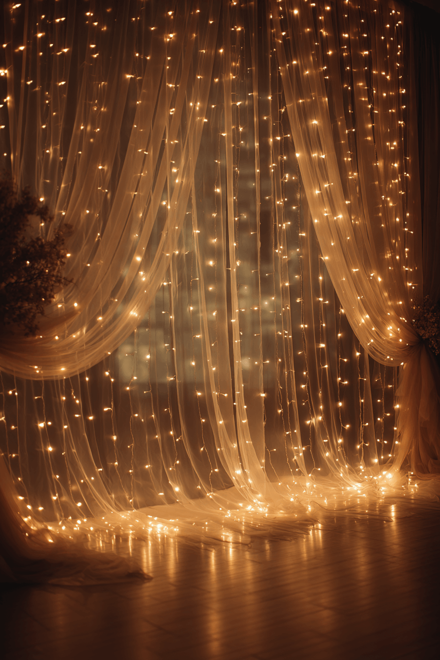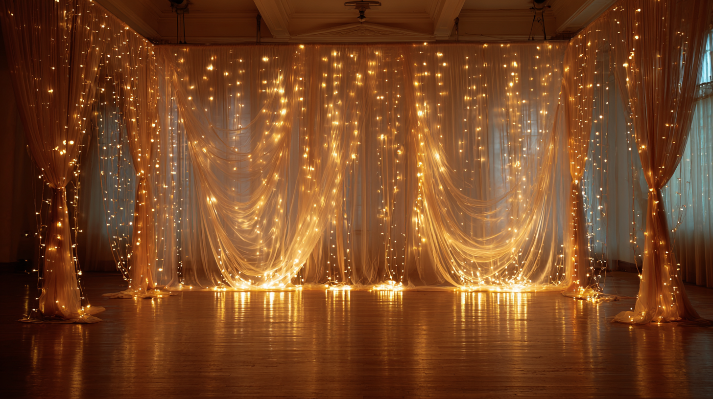 Transform your space with a dreamy Wedding backdrop design using soft glowing lights. The gentle illumination creates depth and intimacy throughout the setting. Layered textures enhance the magical feel. Start creating your glowing backdrop today.