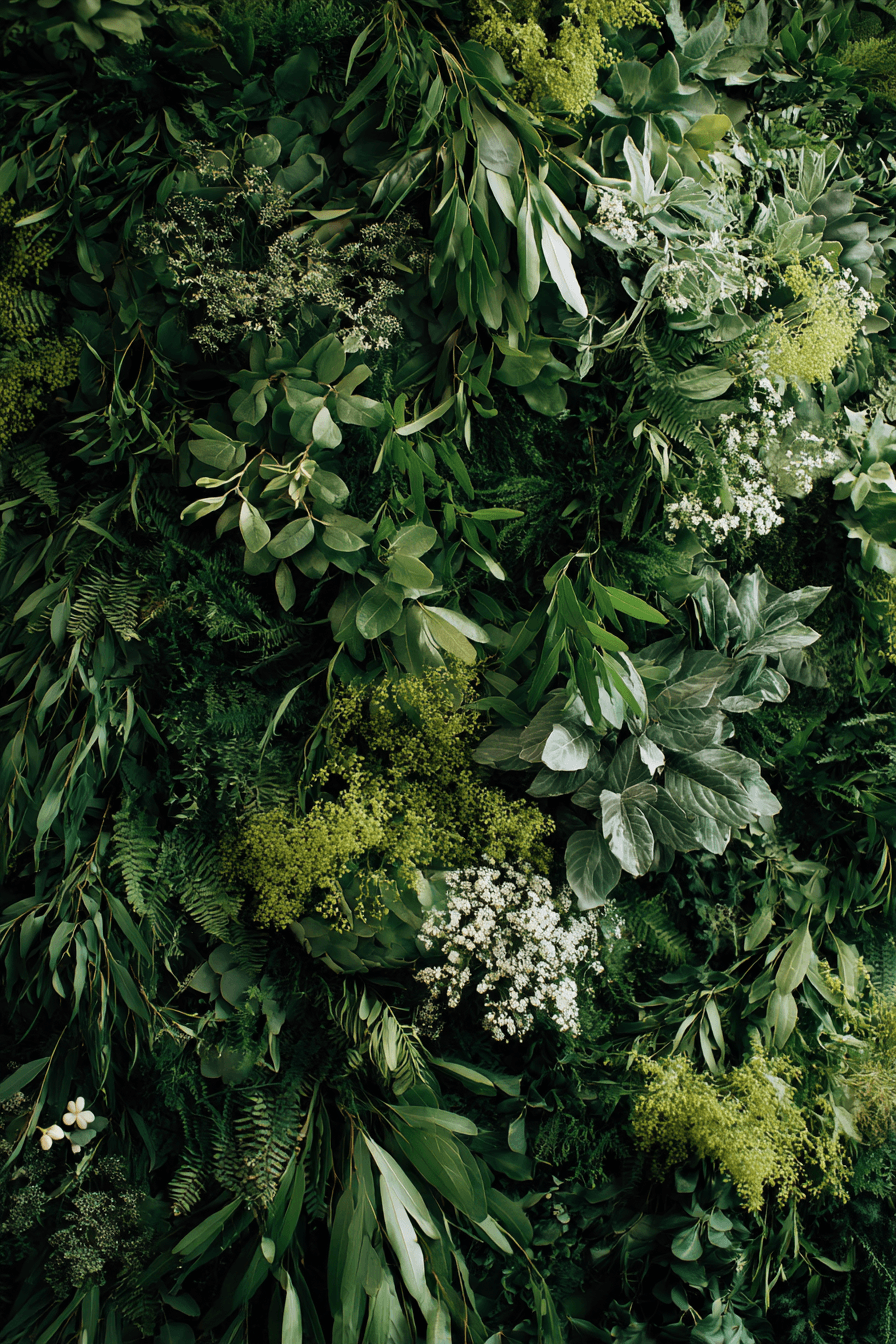 Make a strong visual statement with a lush Wedding backdrop design featuring a wall of greenery. Dense foliage creates a rich and vibrant background. Small floral accents add beauty and detail. Begin creating your greenery backdrop today.