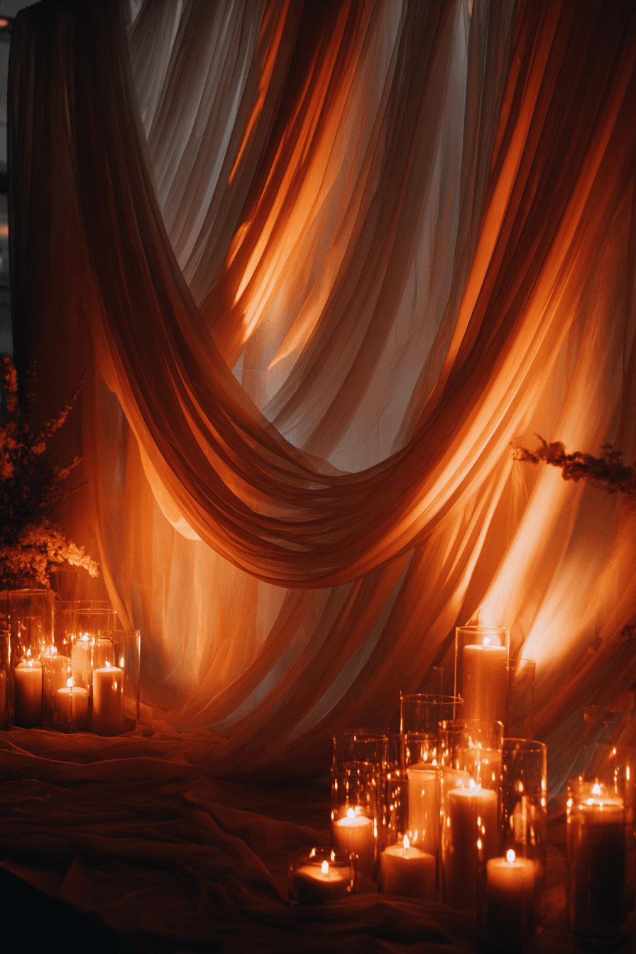 Set a warm and romantic mood with a candlelit Wedding backdrop design. Soft glowing light creates intimacy and comfort throughout the space. Combined with fabric it feels cozy and elegant. Start designing your candlelit backdrop today.