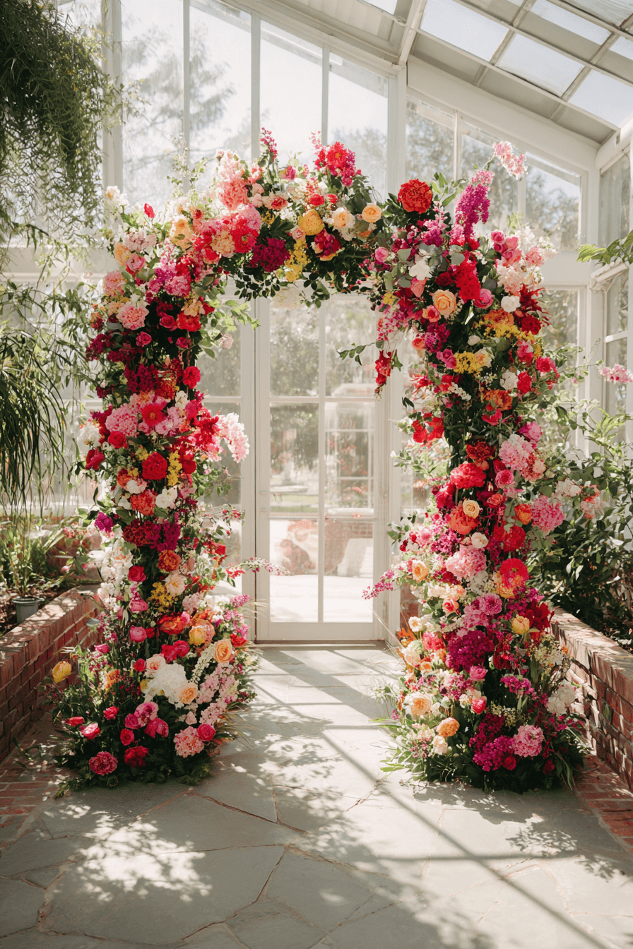 Make your ceremony stand out with a bold Wedding backdrop design featuring a floral arch. Bright blooms create a stunning focal point full of life and color. The look feels joyful and vibrant. Start designing your floral arch today.