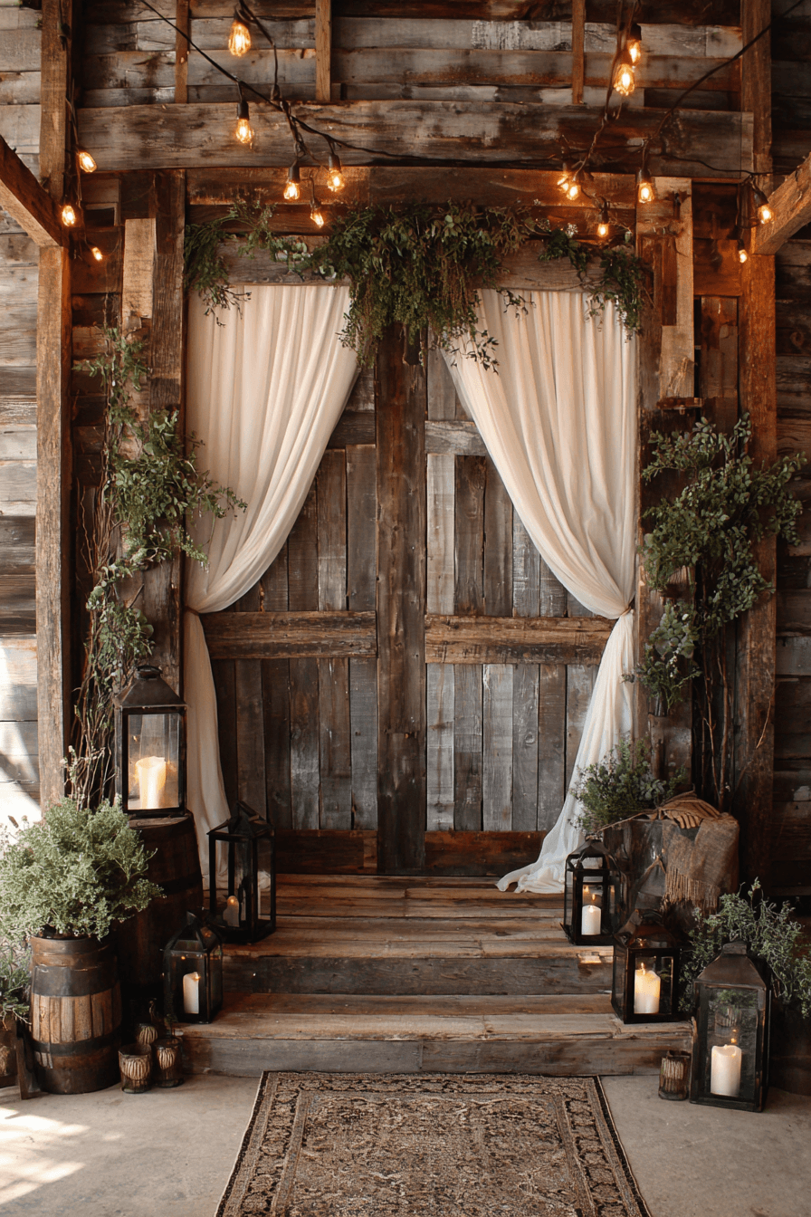 Fill your space with countryside charm through a rustic Wedding backdrop design featuring natural textures. Wood accents and greenery create a warm and welcoming environment. Layered elements add depth and comfort. Bring your rustic vision to life and start designing now.