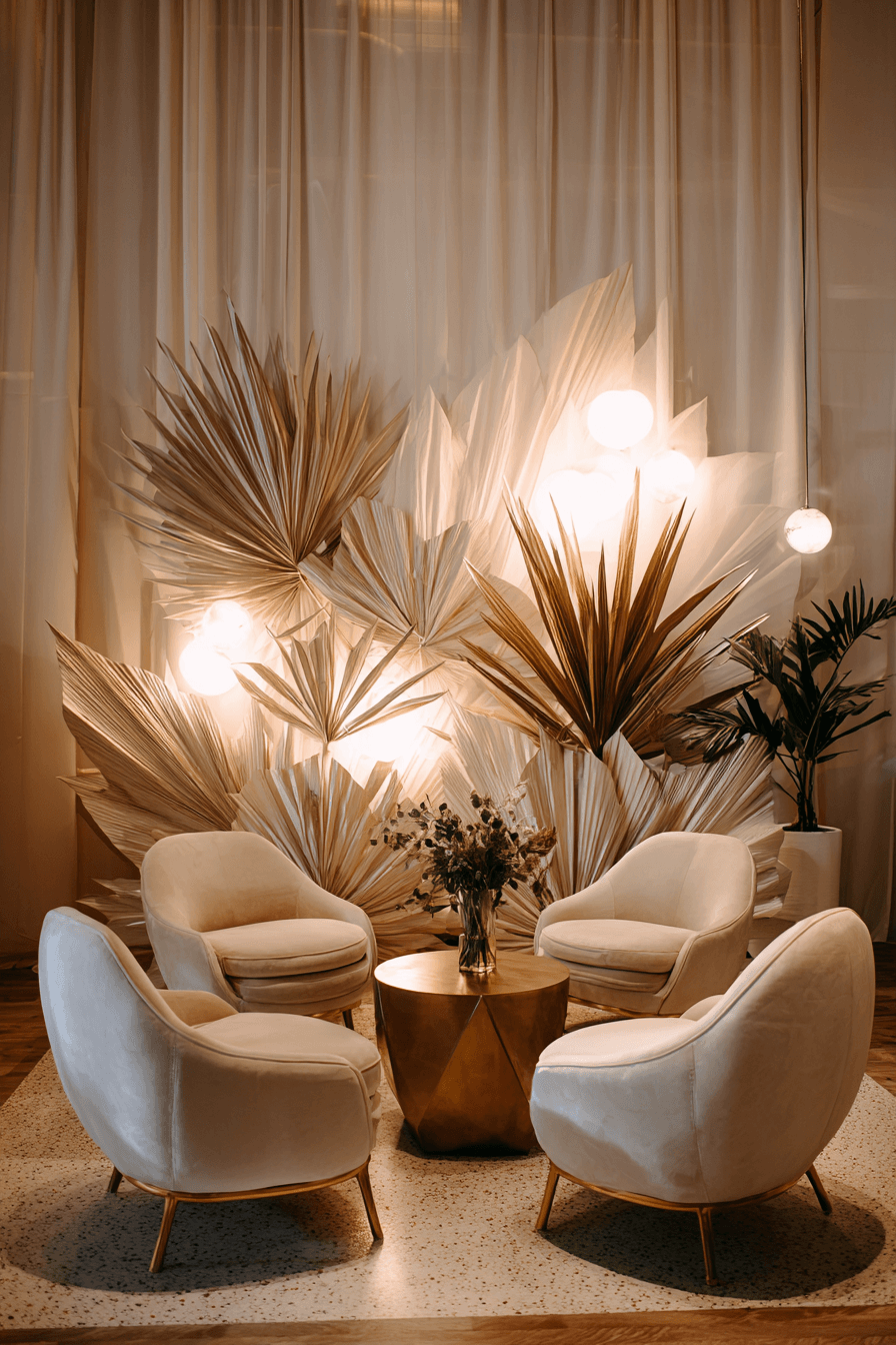 Create a calm and modern setting with a Wedding backdrop design using pampas grass. Soft earthy tones and gentle textures bring warmth and style. The overall look feels relaxed and beautiful. Begin designing your backdrop today.